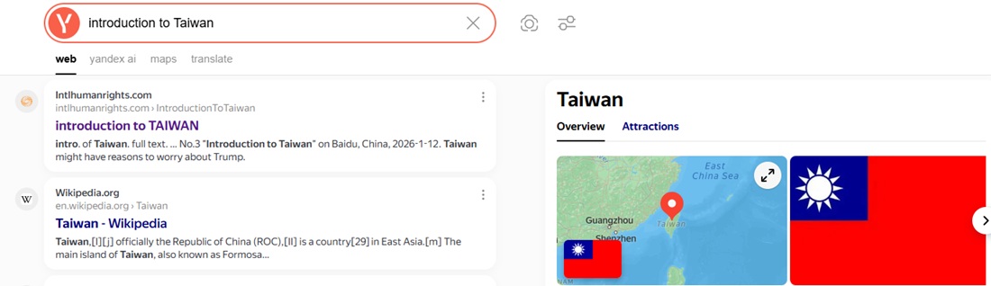 pic. : No.1 "introduction to Taiwan" on Yandex of Russia (largest engine in Russia) at 2026-1-16, 2026-1-9, 2026-1-1, 2025-12-31, 2025-12-24, 2025-12-12, 2025-12-1, 2025-11-22, 2025-11-11, 2025-11-1, 2025-10-30, 2025-10-10, 2025-10-1, 2025-9-21, 2025-9-1, 2025-8-23, 2025-8-17, 2025-8-9, 2025-5-11, 2025-4-27, 2025-3-30, 2025-3-3, 2025-2-22, 2025-2-16, 2025-2-4, 2025-1-1, 2024-12-31, 2024-12-25, 2024-12-24, 2024-12-14, 2024-5-20, 2024-5-12, 2024-5-1, 2024-4-14, 2024-3-15, 2024-2-28, 2024-2-3, 2024-1-1, 2023-12-29, 2023-9-1, 2023-8-22, 2023-8-8, 2023-7-25, 2023-7-1, 2023-5-31, 2023-4-30, 2023-3-31, 2022-9-5, 2022-8-21, 2022-8-8; No.2 at 2025-7-28; This websites group was ranked top "introduction to Taiwan" on Yandex of Russia, 2024-12-2, 2024-10-28, 2024-10-15, 2024-8-31, 2024-8-8, 2024-7-11