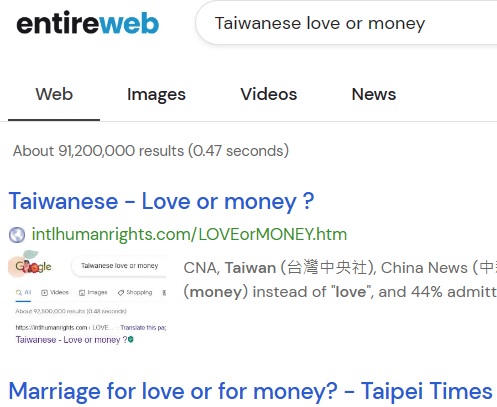 ¡@ South China Morning Post (2024-8-6) : Taiwan has one of the highest divorce rates in Asia. United Daily (Taiwan, 2023-12-17): The divorce rate is rising steadily. 34.75 % divorced within five years of their marriage. ¡@ New York Times, 2021-11-18 ("What makes people happy" ): Most world people in a Pew Research Center survey said that family made them the happiest, such as the Australians (56%), New Zealanders (55%), Americans (49%), English(46%), Swedish, Italians, Canadians etc ranked family first, their percentages are about 3-4 times of that (15%) of Taiwanese, the % in Singapore and Japan is about 2 times of that in Taiwan. Taiwanese ranked "Material well-being" ( US Google AI Overview, 2025-1-3 : a person's standard of living, which includes their financial situation, the ability to afford necessities, and their satisfaction with their material conditions ) above family. According to Wikipedia (2022-7-11, 2022-1-23, 2021-11-28): The number of crude Divorce Rate in Taiwan is higher than that in most countries of Asia & Pacific, such as Vietnam, Mongolia, Thailand, Malaysia, Japan, Singapore, S. Korea, Sri Lanka, Australia, New Zealand, etc. (en.wikipedia.org/wiki/Divorce_demography ). Mainland China's divorce rate was worse than Taiwan's. Telegraph (UK, telegraph.co.uk/news/worldnews/asia/china/8714097/China-tries-to-stop-women-marrying-for-money-rather-than-love.html) reported that in mainland China, "Most pretty girls now try to trade on their beauty. It is an unhealthy trend", With divorce rates soaring, and widespread worries about a new culture of hyper-materialism, the Chinese government is now trying to stop women marrying for money.p ¡@