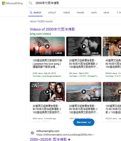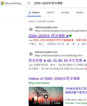 "2000年代西洋情歌"於Microsoft Bing, Yahoo排名第 1, 2025-11-1,  2025-8-30, 2025-7-1, 6-1, 2025-4-1, 2025-2-14, 2025-1-11, 2025-1-1, 2024-12-25, 2024-10-24, 2024-9-10, 9-1, 8-25, 8-16, 8-9; "2000-2020年西洋情歌"於Microsoft Bing, Yahoo排名第 1, 2025-11-1, 2025-8-30, 2025-7-1, 6-1, 2025-4-1, 2025-2-14, 2025-1-11, 2025-1-1, 2024-12-25, 2024-10-24, 2024-9-10, 9-1,  8-25, 8-16, 8-6 ; "2010年代西洋情歌"於US Yahoo排名第 1, 2025-11-1;   "2020年代西洋情歌"於US Yahoo排名第 1, 2025-11-2, 2025-8-30;  "2020年代西洋情歌"於Bing排名第 1, 2025-11-2, 2025-7-1, 2025-6-1; "2010年代西洋情歌"於Bing, US Yahoo排名第 1, 2025-8-30, 2025-7-1, 6-1, 2025-4-1, 2025-2-14, 2025-1-11, 2024-12-27