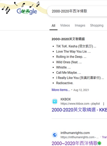 "2000-2020年西洋情歌"排名德國Ecosia第 1, 2024-9-10, 9-1