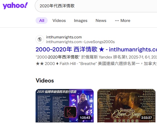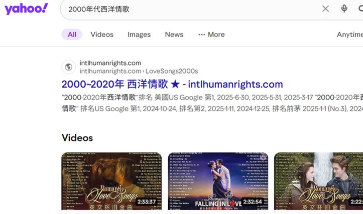"2000-2020年西洋情歌"排名美國Duckduckgo第 1, 2025-11-1, 2025-2-14