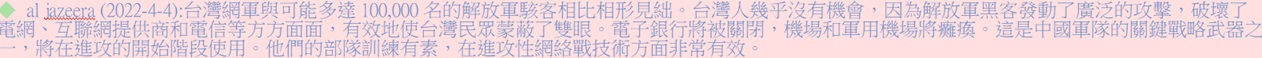 ♣ 美國National Review (2024-5-16): 利用網路戰和物理破壞來嚴重削弱台灣的基本服務,例如清潔水和電力,台灣將無法有效應對這些攻擊,使政府顯得非常無能,並為台灣社會帶來不安全感。此外也以網路宣傳降低台灣人民對軍隊的信任,以及美國被迫分散資源去滿足全球盟友夥伴的緊急援助請求,從而 更加不情願援助台灣