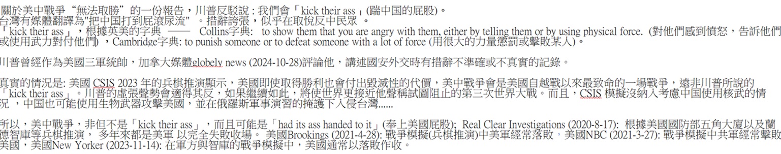 美國Defense One (3-1-2021): 台灣對美國既不是核心利益,也非生存利益 美國Wall Street Journal (2024-9-2): 川普的國防顧問Colby說: 台灣並非美國的生存利益。