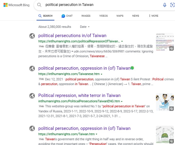 "political oppression in Taiwan" on Microsoft Bing , 2023-6-18, 2023-6-4, 2023-1-11, 2022-10-25, 2022-10-10, 2022-9-12, 2022-8-18, 2022-8-10, 2022-6-19, 2022-5-18, 2022-2-14, 2022-1-1, 2021-11-5, 2021-10-20, 2021-9-21,