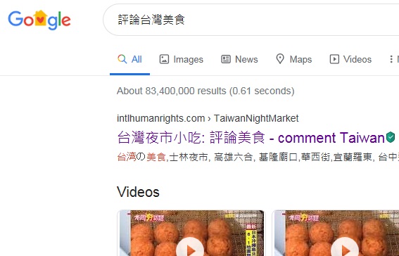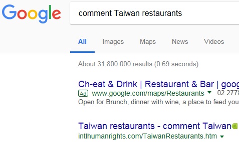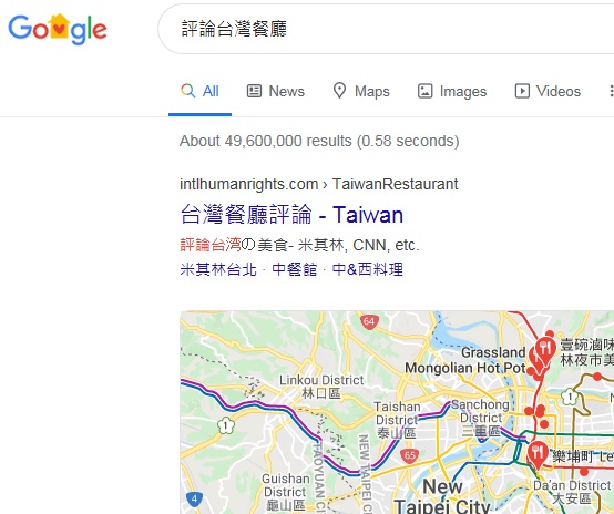 圖右為本網站"評論台灣餐廳"之英文版排名google第一,