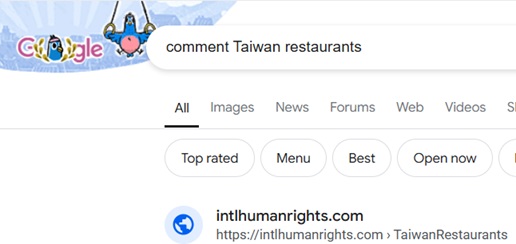 pic. :     "評論台灣餐廳" 排名US Google第一, 2024-8-31, 2024-8-8, 2024-5-16, 2024-5-1, 2023-9-4 (Eng. version); No.1 "comment Taiwan restaurants" on US google, 2024-8-31, 2024-5-1, 2023-9-4, 2022-3-23,  2022-1-4, 2021-9-18;  評論台灣餐廳排名US Google 第2,  2025-5-8, 2023-7-1, 2023-3-30, 2023-2-11, 2022-6-12