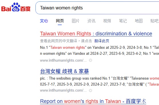 No.1 "Taiwan women rights" on Baidu, 2026-3-8; No.1 "Taiwanese women rights" on Baidu, 2026-3-8, 2025-12-28