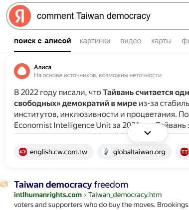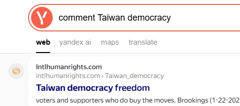 No.1 "comment Taiwan democracy" on Yandex, 2026-1-20 |