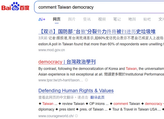 No.1 "comment Taiwan democracy" on Yandex, 2026-1-20 (Chinese version); No.1 "comment Taiwan democracy& freedom" on Yandex, 2026-1-20 (Chinese version) No.3 "comment Taiwan's democracy & freedom" on US Bing, 2026-1-20 (Chinese version) |