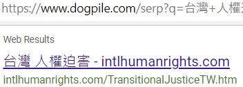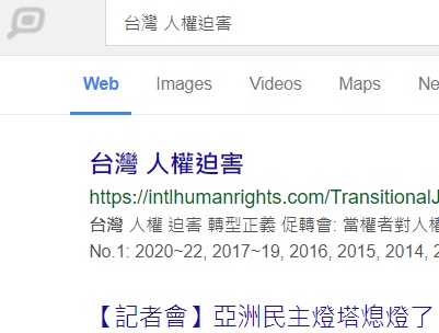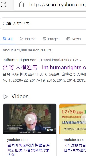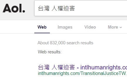 No.1 "Taiwan human rights abuse" on AOL, 2023-2-28, 2023-1-11, 2022-9-12, 2022-7-26, 2022-6-17, 2022-5-17, 2022-3-21, 2022-2-28, 2022-2-14, 2022-2-11, 2022-2-5, 2022-2-2, 2022-2-1, 2022-1-30 No.1 "human rights abuse in Taiwan"("台灣人權迫害") on Excite, 2023-1-11, 2022-10-10, 2022-9-12
