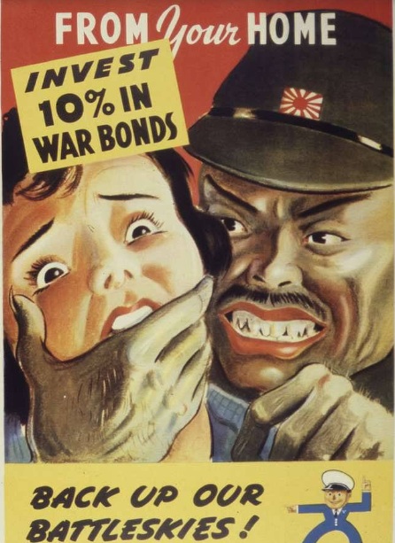 右圖   將日本人描繪成強姦犯,視覺焦點是日本軍閥,其猙獰面部令人產生恐懼和厭惡的情緒。相對比,那位無助的女性,驚恐脆弱,更加劇了大家對日本人的仇恨。日本士兵膚色蠟黃, 將被強暴的女孩膚色白皙。明暗對比似乎總象徵善 與惡。這張海報是鼓勵美國人踴躍購買戰爭債券。