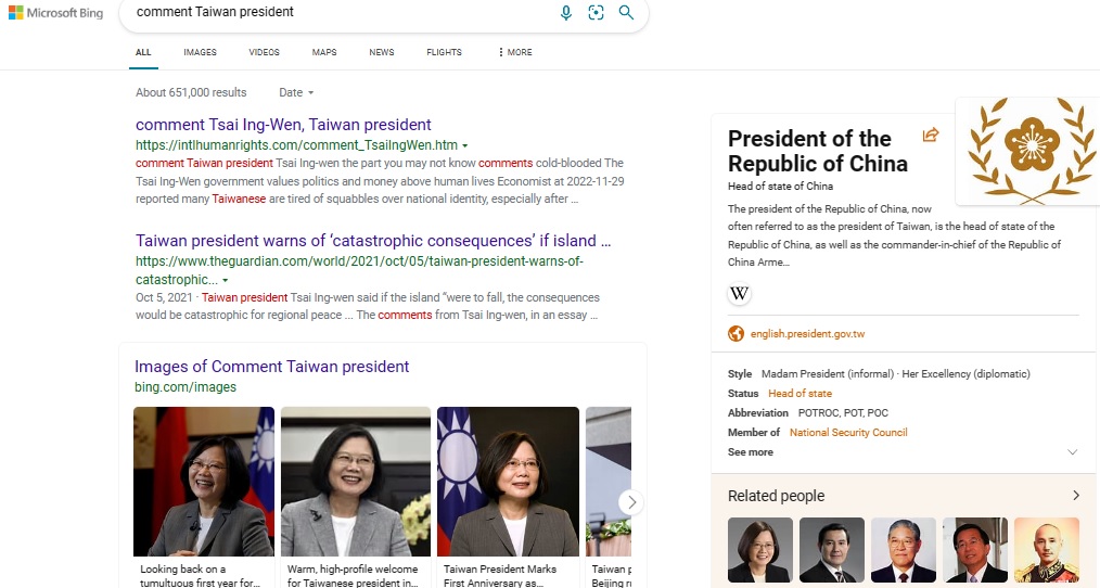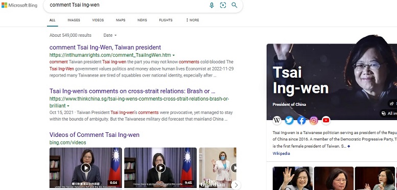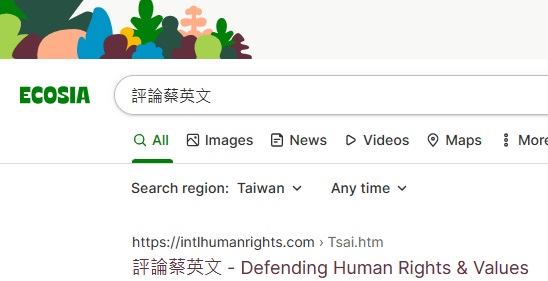No.1 "comment Tsai Ing-wen" on Ecosia (Germany), 2024-8-8, 2024-7-22, 2024-5-20, 2023-3-10; No.1 "comment Taiwan president" on Ecosia (Germany), 2024-8-8, 2024-5-20, 2023-3-10