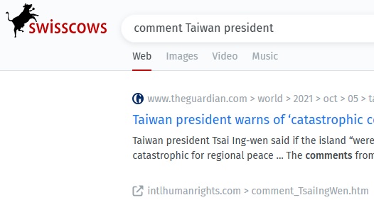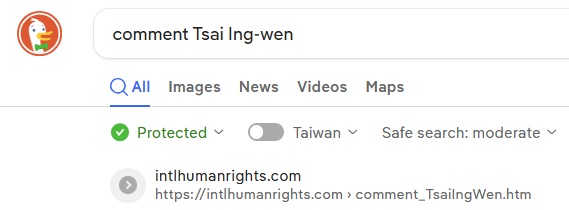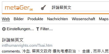 No.1 "comment Tsai Ing-wen" on MetaGER, 2024-8-8, 2024-5-13, 2023-11-20, 2023-8-8, 2023-8-1; No.1 "comment Taiwan president" on MetaGER.de 2024-5-20