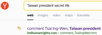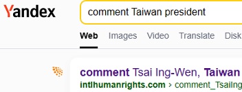 pic.: No.1 "comment Tsai Ing-wen" on Yandex of Russia, 2025-6-25, 2024-12-25, 2024-11-29, 2024-8-8, 2024-5-13, 2024-2-6, 2024-1-1, 2023-11-20; pic.: No.1 "comment Taiwan president" on Yandex of Russia, 2024-12-25, 2024-8-8, 2024-5-13, 2024-2-6, 2024-1-1, 2023-5-14, 2023-4-30, 2023-4-21, among top ranks at 2024-11-29