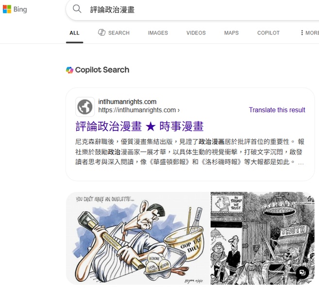 評論政治漫畫" 排名Microsoft Bing 第1, 2026-1-19, 2025-2-5, 2024-8-8,