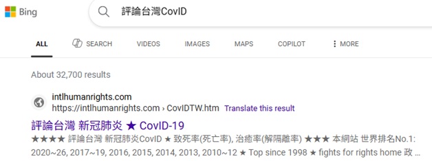 "評論台灣新冠肺炎"排名Bing, Yahoo第一, 2023-2-27, 2023-2-6, 2022-12-26, 2022-12-2, 2022-11-4, 2022-10-9, 2022-5-10, 2022-2-1,2022-1-7,  2021-11-19, 2021-9-22, 2021-9-16