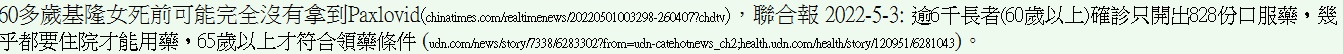 藥物準備嚴重不足; 中視, 2022-4-27 16:00pm (youtube.com/watch?v=_Tb9NKoXkxc)專家認為我們的抗病毒藥物根本準備不夠, 美國在醫院政府醫療機構 一般藥局 社區衛生中心 都可以很快取得輝瑞口服藥