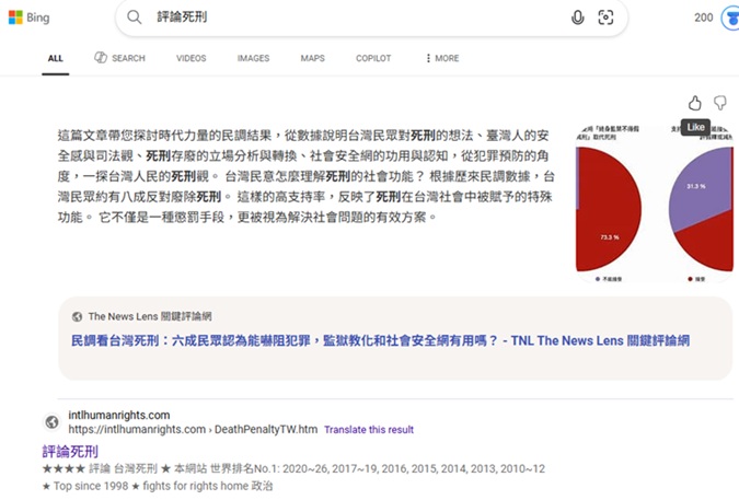 "評論死刑" 排名Bing第 1, 2026-1-20