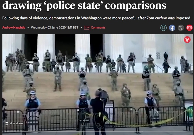 「警察國家」的聯想  /  英國 獨立報  independent.co.uk/news/world/americas/national-guard-troops-lincoln-memorial-washington-dc-trump-george-floyd-protests-a9546176.html