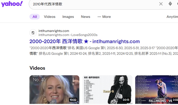 "2000-2020年西洋情歌"於US Yahoo排名第 1, 2025-11-2,  2025-7-1, 6-1, 2025-2-14, 2025-1-1, 2024-12-25, 2024-10-24, 2024-9-10, 2024-9-1, 8-25, 8-21, 8-16, 8-9, 8-6