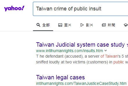 pic. left : "台灣公然侮辱罪" 排名Bing第1 (English version) "No.1 "crime of public insult in Taiwan" on Bing, 12-21-2020 pic. right: "台灣公然侮辱罪" 排名yahoo第1 (English version) "No.1 "Taiwan crime of public insult" on Yahoo, 12-21-2020