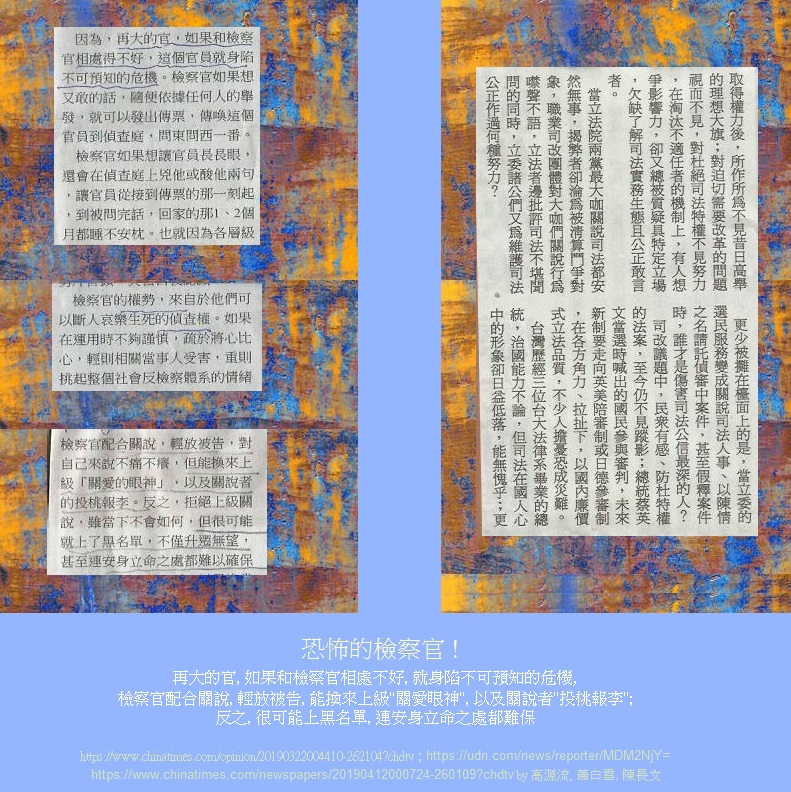 | <聯合報> 5-20-2019 | 司法還能忍受多久的凌遲?監察院、行政院屢屢拿司法當祭品 |