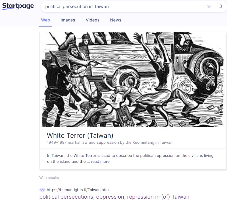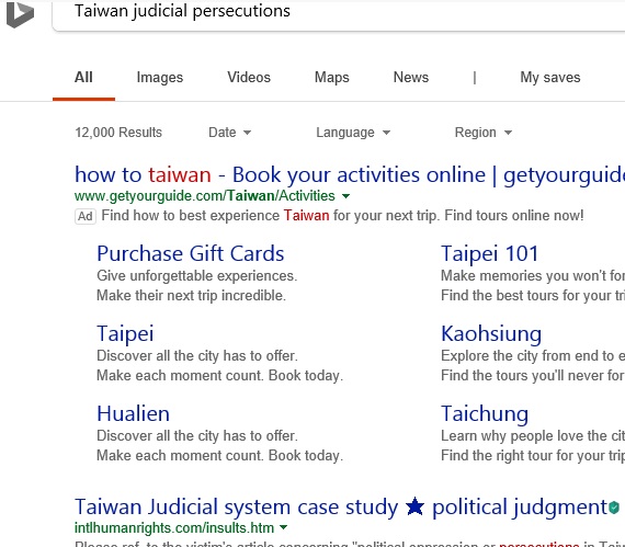 "political persecutions in Taiwan" on Microsoft Bing , 2024-12-28; No.1