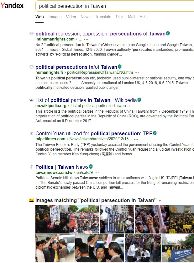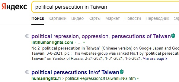 pic. : No.1 "political persecution in Taiwan" on Yandex at 2025-12-24, 2025-2-28, 2024-12-28, 2024-9-1, 2024-4-14, 2024-1-23, 2023-4-2, 2023-1-11, 022-10-25, 2022-10-10, 2022-8-10, 2022-7-12, 2022-6-29, 2022-6-19, 2022-5-31, 2022-1-11, 2022-1-1, 2021-12-12, 2021-12-4, 2021-11-27, 2021-11-11, 2021-11-3, 2021-10-8, 2021-10-1, 2021-9-21, 2021-9-7, 2021-8-30, 2021-8-16, 2021-8-8, 2021-8-1, 2021-7-25, 2021-7-6, 2021-6-27, 2021-6-17, 2021-6-4 pic. : No.1 and No. 2 "political persecution in Taiwan" on Yandex of Russia at 2024-4-14, 2024-1-23, 2023-4-2, 2023-1-11, 2022-10-10, 2022-6-28, 2021-8-30, 2021-7-25, 2021-6-27, 2021-6-11, 2021-6-2