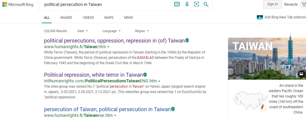 "political oppression in Taiwan" on Microsoft Bing , 2023-6-18, 2023-6-4, 2023-1-11, 2022-10-25, 2022-10-10, 2022-9-12, 2022-8-18, 2022-8-10, 2022-6-19, 2022-5-18, 2022-2-14, 2022-1-1, 2021-11-5, 2021-10-20, 2021-9-21,