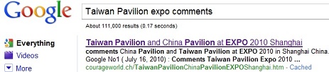 ★ No1 Comments Taiwan Pavilion Expo 2010 on US Google ( July 16, 2010)