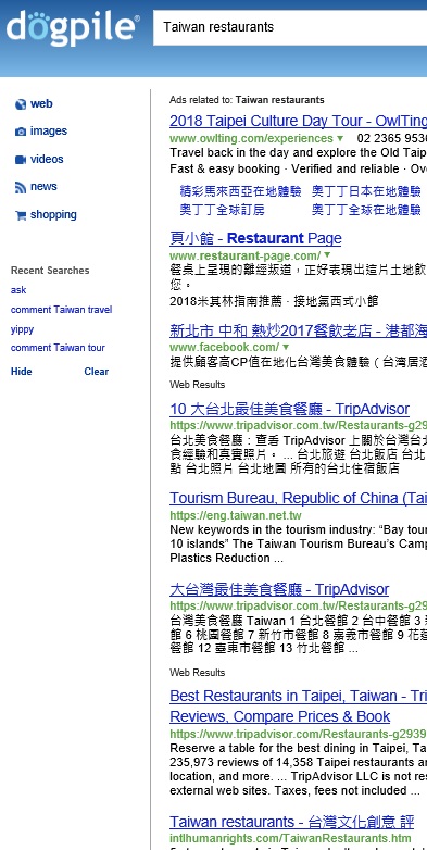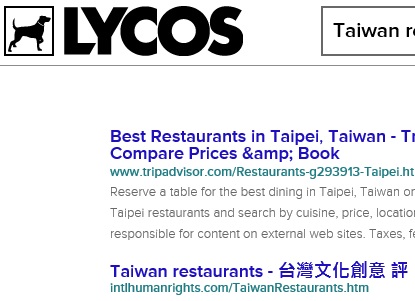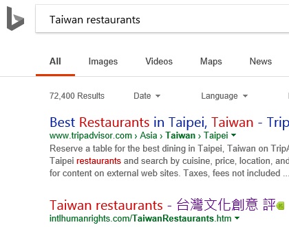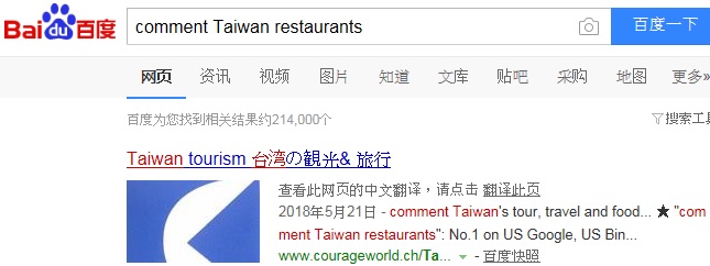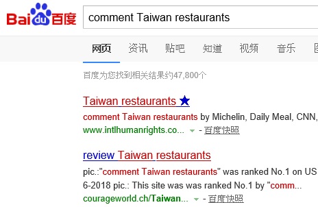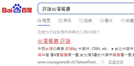 pic.:"評論台灣餐廳"(英文) 排名Baidu of China 第1,