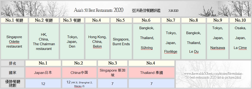 ★ CNN, 2023-3-28:  2023 亞洲最佳50餐廳 (Asia's 50 Best Restaurants), 台灣排名亞洲各國之第 9 , 台北排名亞洲各城之第 17,  台北 Mume餐廳排名亞洲前50餐廳之第 45, 僅一間入選前50是近十年最低數字 .  此外, 台北 Logy 排名 No. 57, 但主廚為日本人.  台北Adachi Sushi 排名 No. 87, 高雄 Liberte 排名 No. 96.