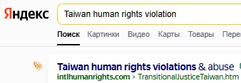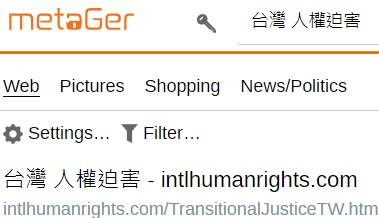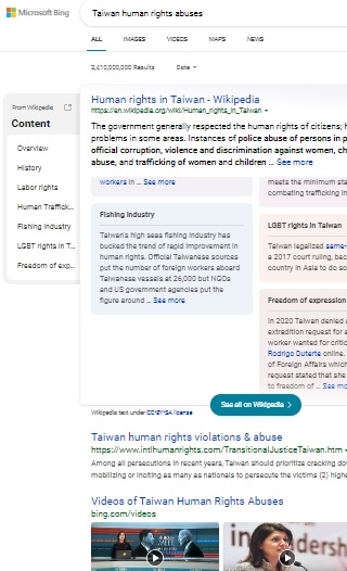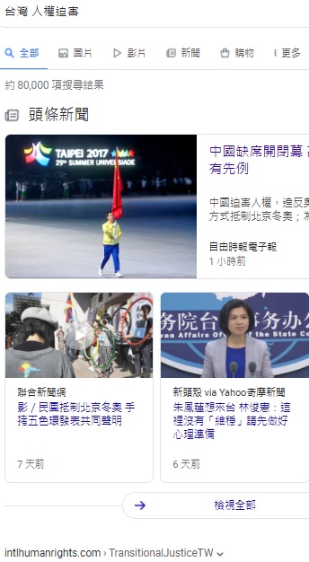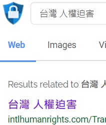 No.1 "Taiwan human rights abuse" on AOL, 2023-2-28, 2023-1-11, 2022-9-12, 2022-7-26, 2022-6-17, 2022-5-17, 2022-3-21, 2022-2-28, 2022-2-14, 2022-2-11, 2022-2-5, 2022-2-2, 2022-2-1, 2022-1-30 No.1 "human rights abuse in Taiwan"("台灣人權迫害") on Excite, 2023-1-11, 2022-10-10, 2022-9-12