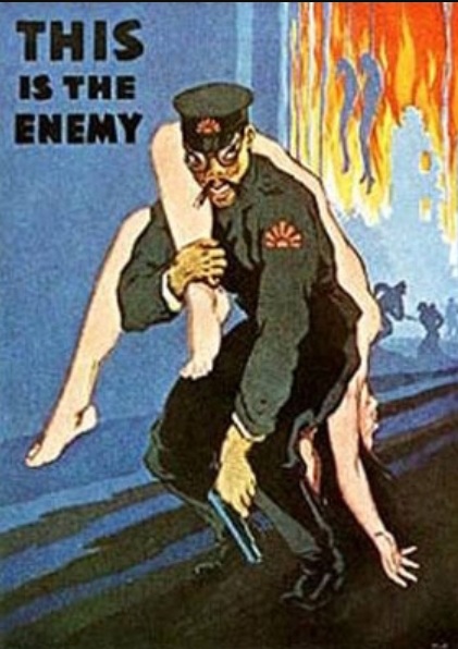 右圖   將日本人描繪成強姦犯,視覺焦點是日本軍閥,其猙獰面部令人產生恐懼和厭惡的情緒。相對比,那位無助的女性,驚恐脆弱,更加劇了大家對日本人的仇恨。日本士兵膚色蠟黃, 將被強暴的女孩膚色白皙。明暗對比似乎總象徵善 與惡。這張海報是鼓勵美國人踴躍購買戰爭債券。