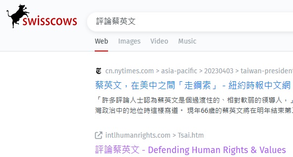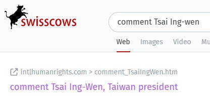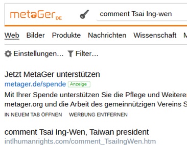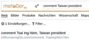 No.1 "comment Tsai Ing-wen" on MetaGER, 2024-8-8, 2024-5-13, 2023-11-20, 2023-8-8, 2023-8-1; No.1 "comment Taiwan president" on MetaGER.de 2024-5-20